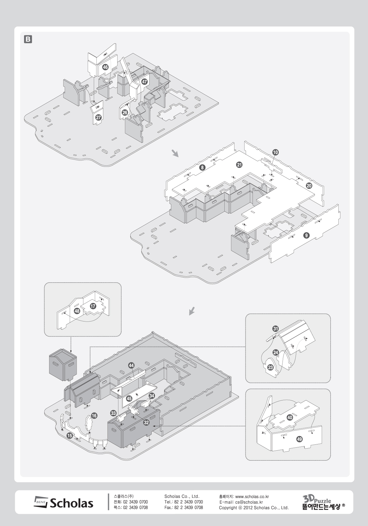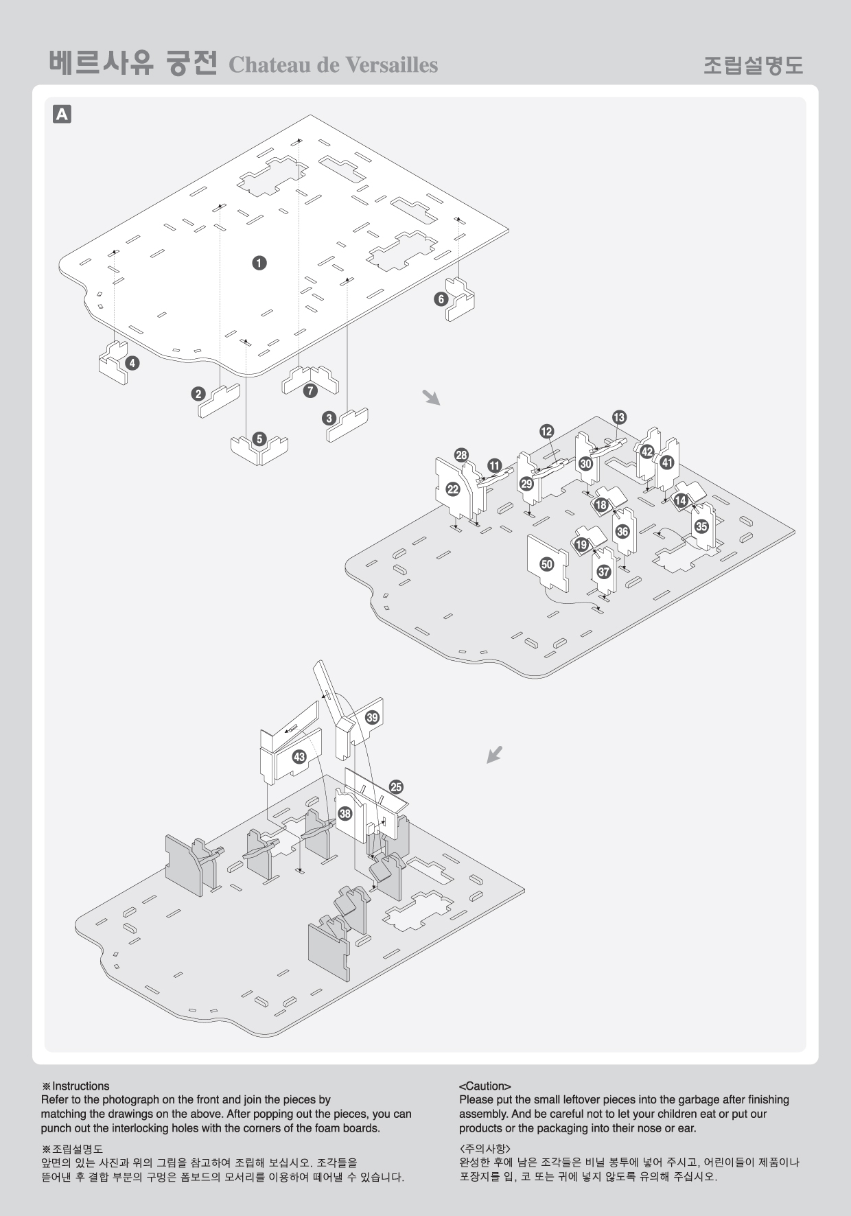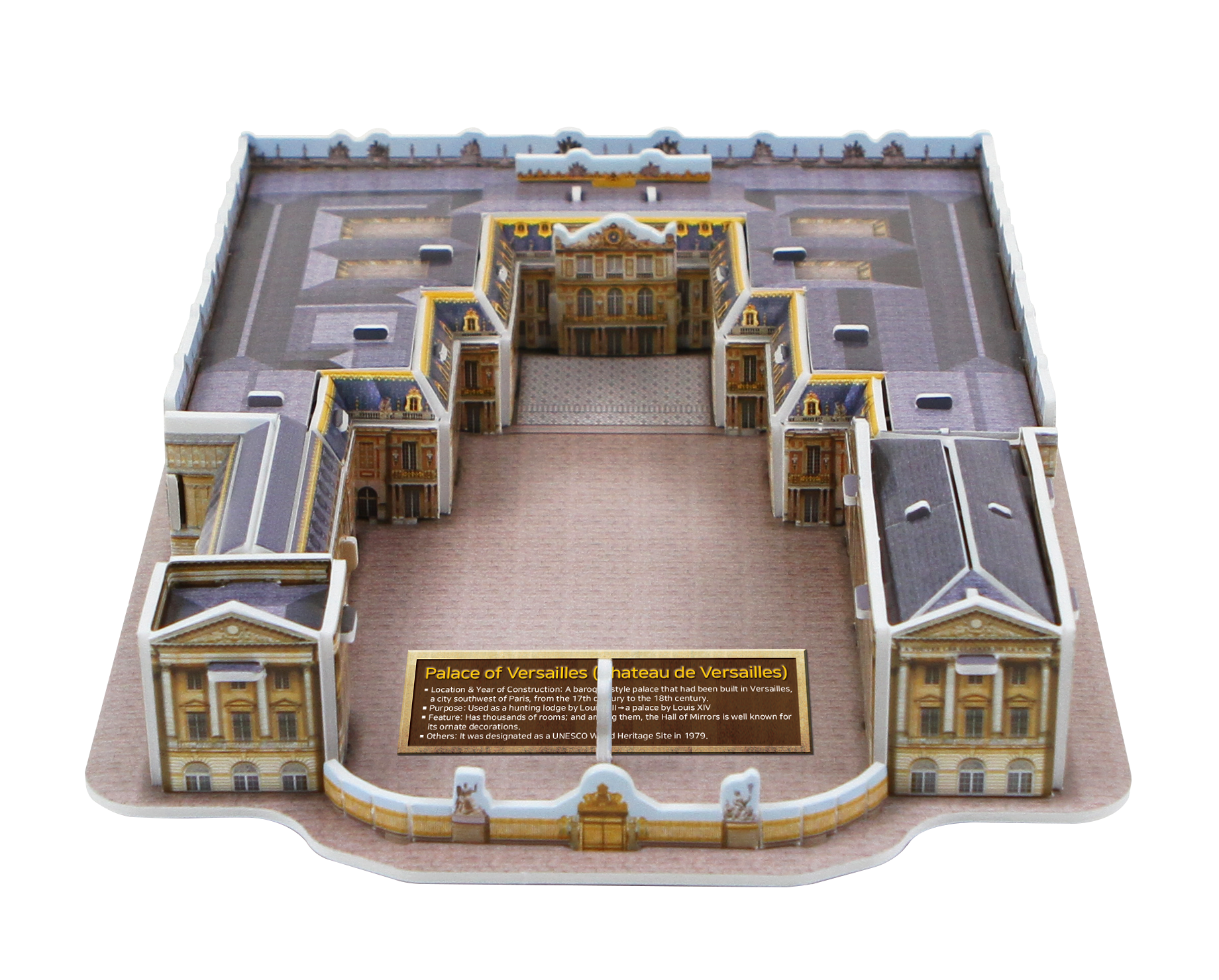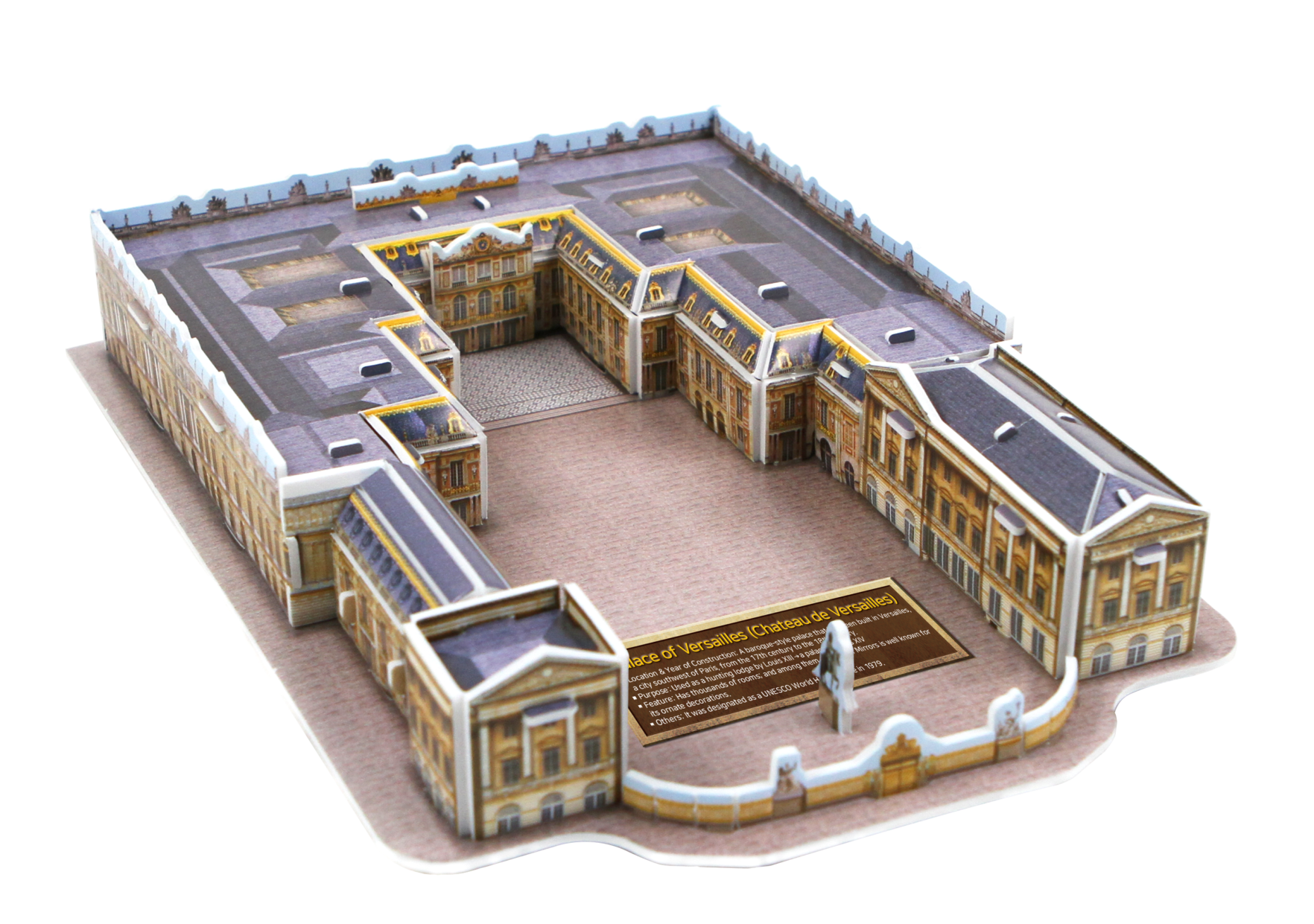 Category: Playedu : World History-Modern Model Name: Palace of Versailles Model No.: SE12-0346 PCS: 50 Ages: 8+ Difficulty: ★★★☆☆☆☆ Assembled Size: 153x219x39(mm) Board Size: 300×210(mm)x2Sheets Product Contents: Puzzle Board, Instruction Sheet, Worksheet