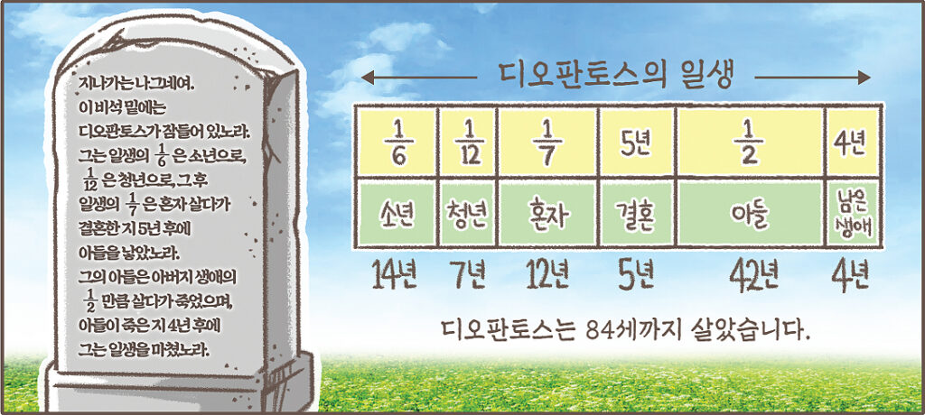 디오판토스와 파로스 등대&묘비 (Diophantus and the Pharos Lighthouse & Tombstone)Take the quiz and check your answers! 디오판토스의 묘비 Quiz 1. <등대 원조 맛집>에서 찹쌀떡 6개를 주문해서 몇 개를 먹었더니 2개가 남았습니다. 먹은 것이 몇 개인지 구해 보세요. 정답 : 2. <등대 원조 맛집>에서 꼬마김밥 몇 개를 주문해서 7개를 먹었더니 13개가 남았습니다. 주문한 꼬마김밥은 몇 개인지 구해 보세요. 정답 : Go Back
