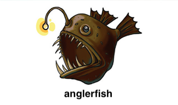 Even just 195 meters below the ocean surface, it’s completely dark because no sunlight can reach. The water is very cold, between 1–4°C. The water pressure is very high, and there is very little oxygen. Because there’s no light, plants like phytoplankton can’t grow. That means animals that eat plankton also can’t survive easily, so there’s not much food. To live in this tough environment, deep-sea animals have developed special features. For example, the anglerfish has a glowing light on its head and a big mouth with sharp, scary teeth. Why do you think the anglerfish looks like this?
