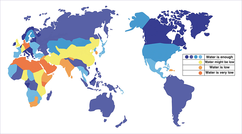 The map below shows where water is running low around the world. Fill in the blanks with the correct words to complete the sentences.