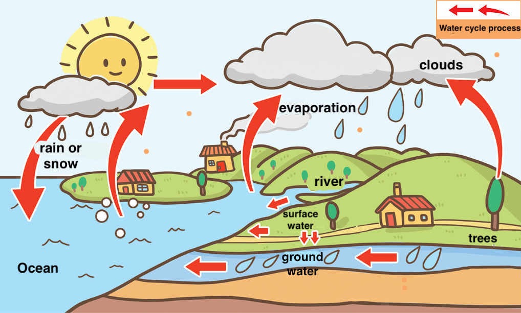 Activity 2: Look carefully at the water cycle model and the picture below. Then write where the water goes.