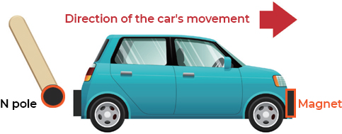 Once you have assembled the car, use the magnet on the stick to move the car forward. What magnetic force should you use? If the magnetic face of the stick is the N pole, what pole will face the car’s magnet? Complete the blanks below to figure it out. In a round magnet, the circular faces serve as the poles, with the upper and lower surfaces having different poles.