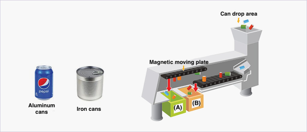 There are aluminum and iron cans. To recycle them properly, they need to be sorted by type. When cans are placed into a sorting machine with a magnet, those that are attracted to the magnet will stick to the magnetic moving plate and be collected in Box (A). The cans that are not attracted will continue along the conveyor belt and be collected in Box (B).