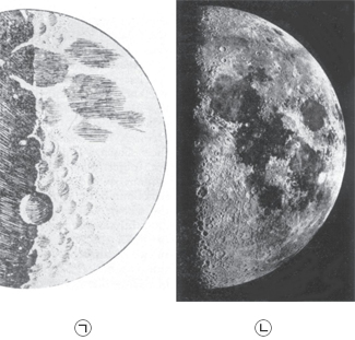 내 그림 솜씨는 제법 뛰어나요. 그런데 사람들이 내 그림을 보 고 깜짝 놀랐다고 해요. 매끈하고 완벽한 공 모양이라고 알려 져 있던 어떤 천체의 모습을 울퉁불퉁하게 그렸기 때문이에 요. ㉠은 지금 내가 관찰한 것을 그대로 손으로 그린 것이고 ㉡ 은 나중에 사진으로 찍은 것이에요. 이것은 무엇일까요?