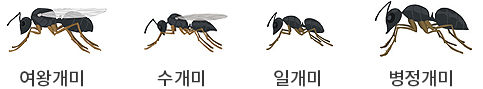 날개가 있는 여왕개미와 수개미는 혼인 비행을 통해 짝짓기를 해요. 짝짓기 후 여왕개미는 땅에 착륙하여 날개를 떼어 내고 알을 낳고 돌봅니다. 알에서 나온 일개미는 집단으로 먹이를 구하고 알을 돌보고 병정개미는 개미 집단을 지키는 등 분업을 해요. 날개가 있는 여왕개미와 수개미와는 달리 일개미, 병정개미는 날개가 없답니다. 개미의 모양을 관찰하 고 개미의 특징을 적어 보세요. 개미는 곤충일까요? 곤충이 아닐까요?개미
