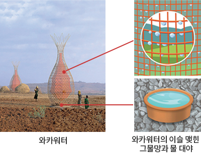 와카워터는 물이 부족한 지역에서 물을 얻을 수 있는 장치예요. 낮에는 온도가 높아서 물이 증발하 면서 수증기로 변하게 되지요. 밤이 되면 온도가 낮아져서 기체 상태였던 수증기가 다시 물로 변하