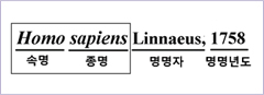 의 이름을 붙이는 방식이에요. 예를 들어 사람은 Homo sapiens(호모 사피엔스)라고 쓰는데 Homo는 속의 이름(속명), sapiens는 종의 이름(종명)이에요. 속명과 종명은 라틴어로 쓰고 비스듬히 기울어진 글씨체로 속명의 첫 글자는 대문자로, 나머지는 소문자로 써요. 이명법은 속명+종명 뒤에 이름을 붙인 사람과 이름 붙인 연도를 쓰기도 하는데 명명자(이름을 지은 사람)에는 내 이름을 라틴어로 쓴 Linnaeus가 많이 써 있답니다. 여러분이 새로운 생물을 찾아 이름을 붙인다면 명명자에 여러분의 이름이 들어가겠죠?