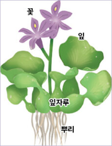 부레옥잠은 열대 지방에서는 여러해살이지만 한국에서는 한해살이를 하며 7~8월경에 연보라색 꽃이 핍니다. 부레옥잠은 오른쪽 그림과 같이 물에 떠서 사는 부유 식물입니다.