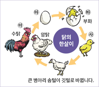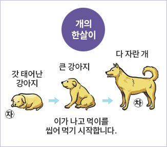 개구리, 닭과 같이 알을 낳는 동물과 개나 소와 같이 새끼를 낳는 동물이 있어요. 개구리, 닭, 개의 한살이 과정을 관찰해 보세요.