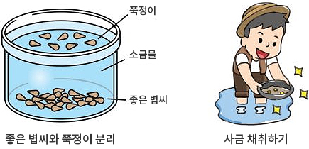 때문에 떠 있는 볍씨는 버리고 가라앉은 볍씨로만 농사를 지어요.자연 상태에서 금이 모래에 섞여 있는 경우가 있는데 이를 ⑥
