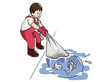 | 바다 생태계를 보호하기 위해서 망이 너무 촘촘한 그물은 사용이 금지되어 있어요. 큰 물고기만 잡고 새끼 물고기 는 잡지 못하도록 한 조치이지요. |