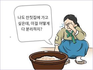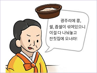 계모에게 구박받는 콩쥐가 오늘은 광주리에 섞여 있는 콩과 쌀, 좁쌀을 각 곡식별로 분리해 내야해요. 콩쥐에게 어떤 도구가 필요한지 써 보세요.