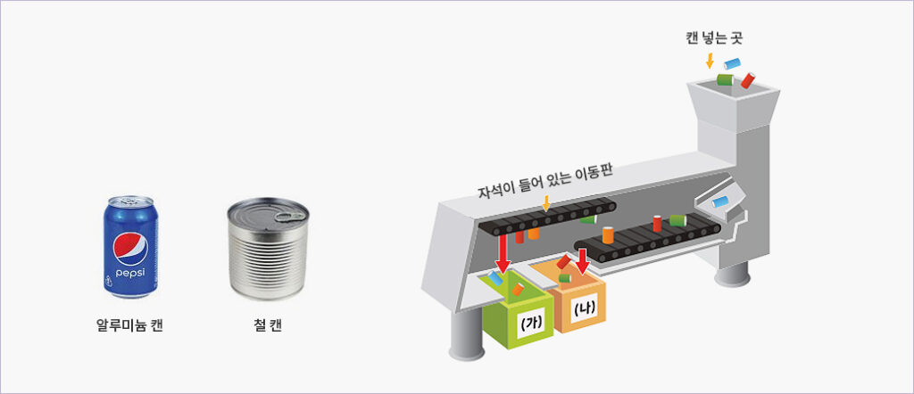 캔은 알루미늄으로 만들어진 것과 철로 만들어진 것이 있어요. 재활용하기 위해서는 캔의 종류에 따라 분리해야 해요. 자석이 들어 있는 분리수거 장치에 캔을 넣으면 자석에 붙을 수 있는 캔은 위쪽의 자석이 들어 있는 이동판에 붙어서 이동하다가 (가) 상자에 모이고, 자석에 붙지 않는 캔은 아래 있는 컨베이어 벨트를 따라 이동하다가 (나) 상자에 모입니다.